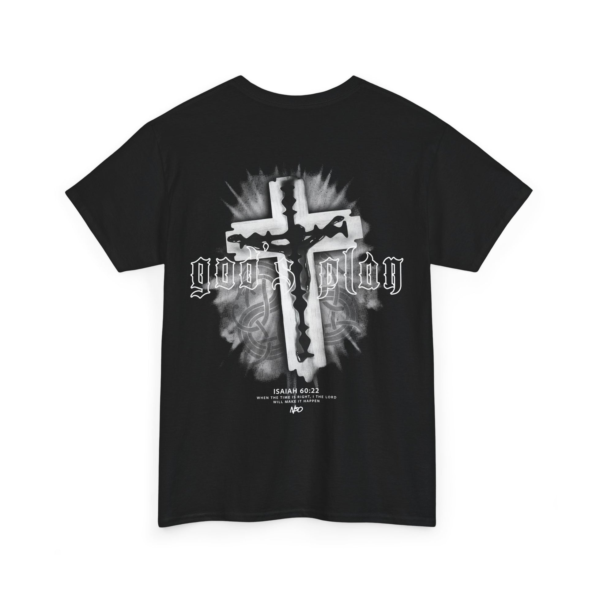 Gods Plan Black T-Shirt with a unique design, suitable for adults. Made with 100% cotton, this T-shirt offers comfort and durability. The tear-away label ensures a scratch-free experience, while the dual printing techniques provide crisp, detailed designs.